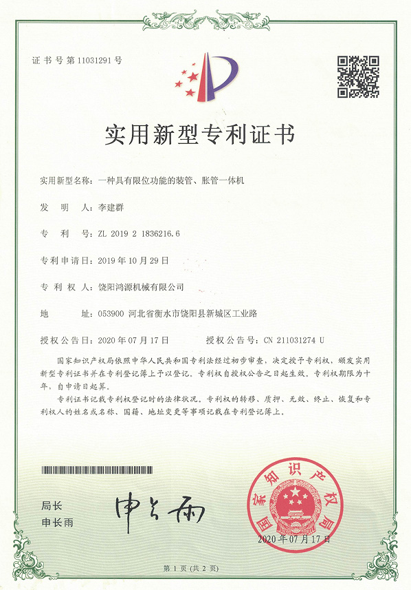 装管、胀管一体机实用新型专利证书